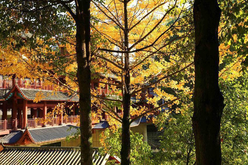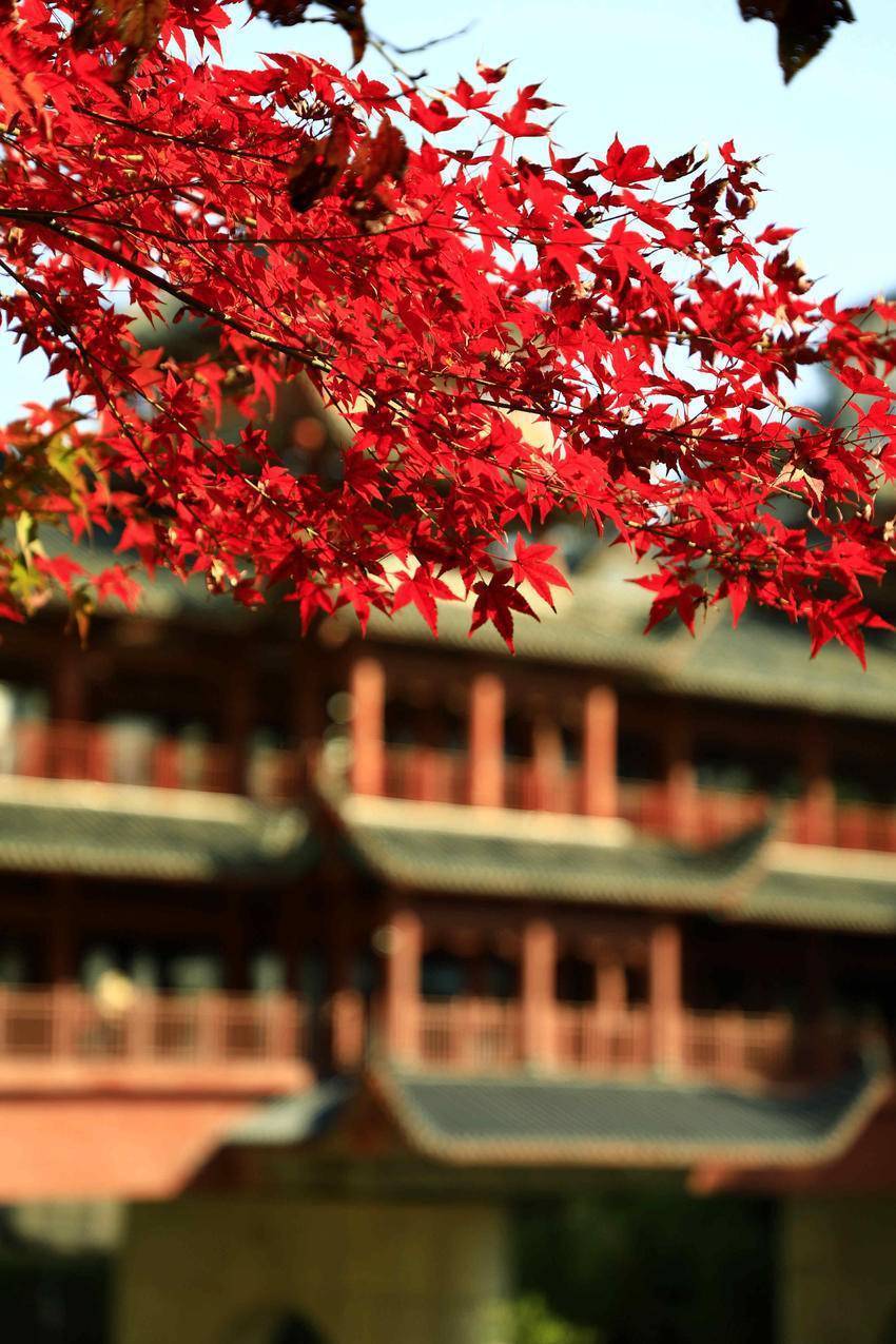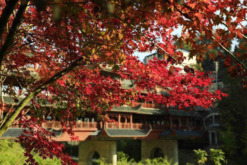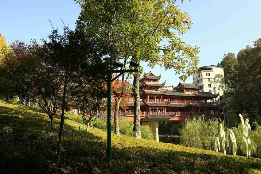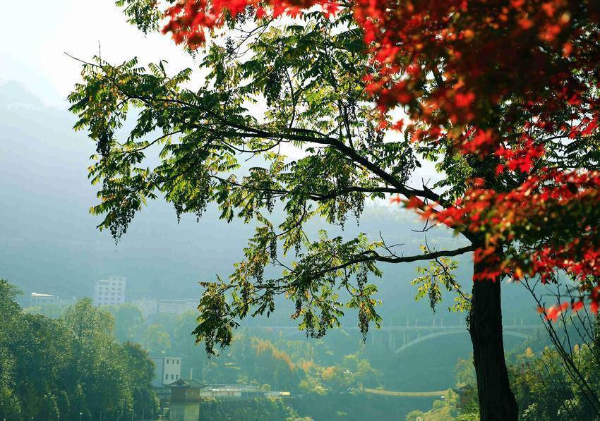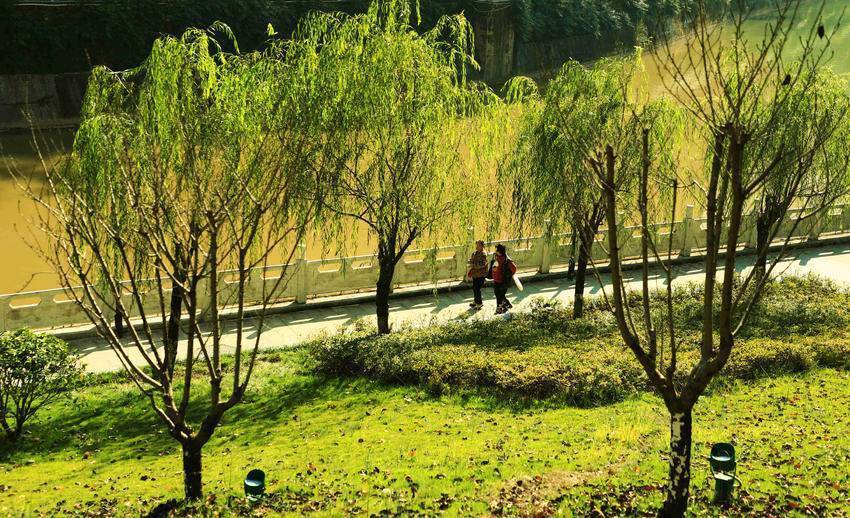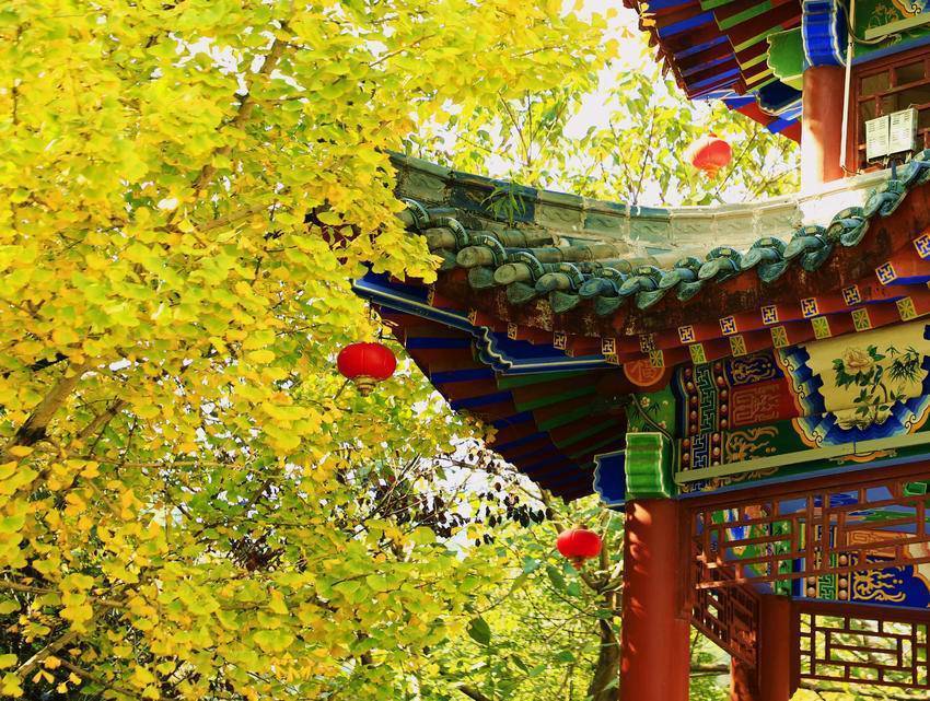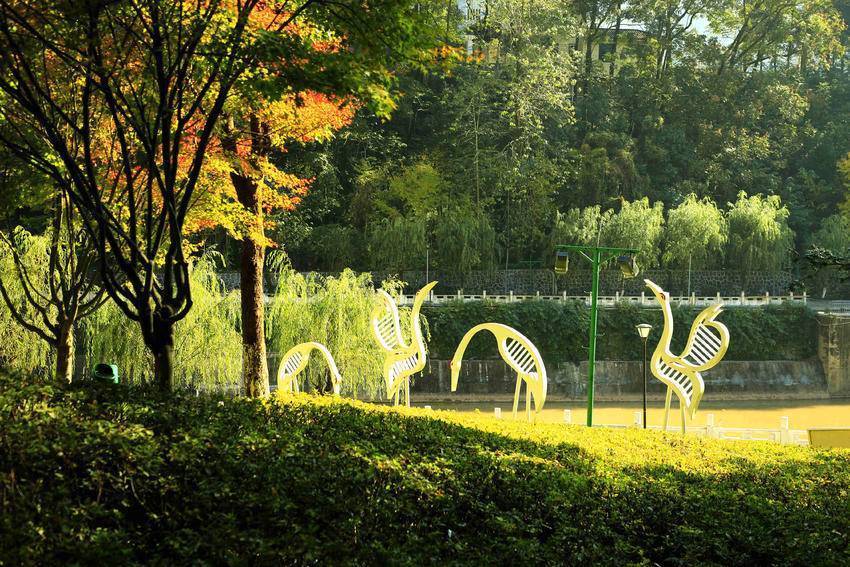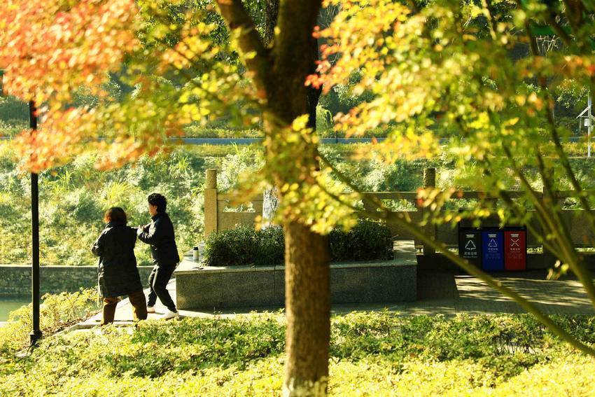 11月24日,农历小雪时节。走进城区容美镇一隅,红枫似火,银杏辉金,杨柳依依,竹影清风。