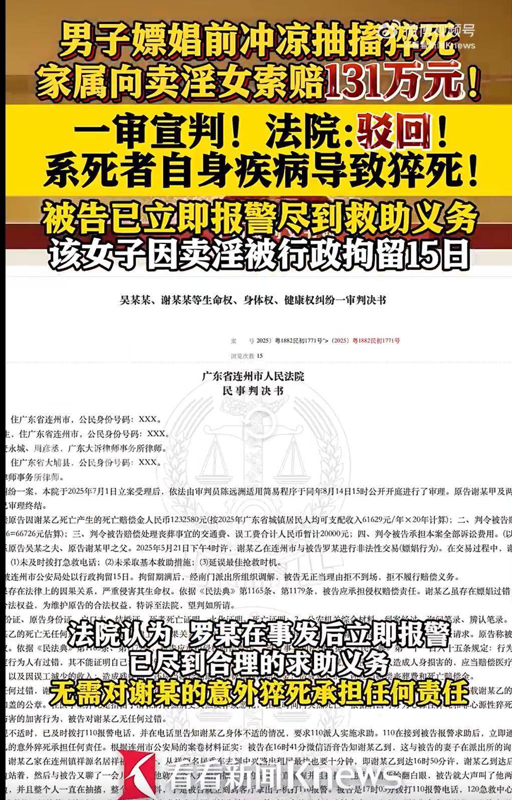 9月18日,广东省连州市人民法院对男子谢某乙“嫖娼猝死案”一审判决,驳回了谢某乙妻子和女儿的诉讼请求。2025年5月21日下午,谢某乙主动联系罗某要求发生性行为,两人见面后,谢某乙冲凉后准备与罗某发生性关系时,谢某乙突然身体抽搐,罗某立即到客厅用手机拨打110报警。约10分钟后,医生及警察都到达现场。之后谢某乙经抢救无效死亡。事后,公安机关认定谢某乙死因为“猝死”。警方同时对罗某的卖淫行为,作出了行政拘留十五日的处罚。之后,谢某乙的妻子和女儿作为原告,将罗某告上法庭,要求赔偿死亡赔偿金、丧葬费及误工费等共计约131万元。连州市人民法院一审驳回了这一诉讼请求。(据9月23日看看新闻)